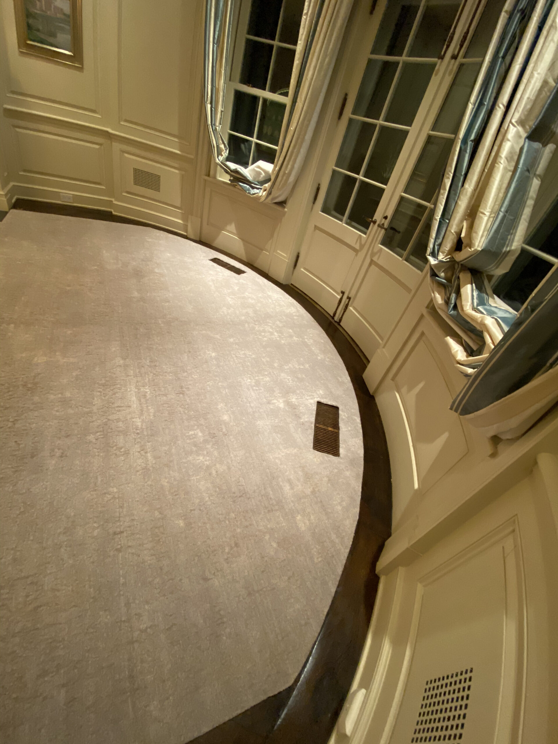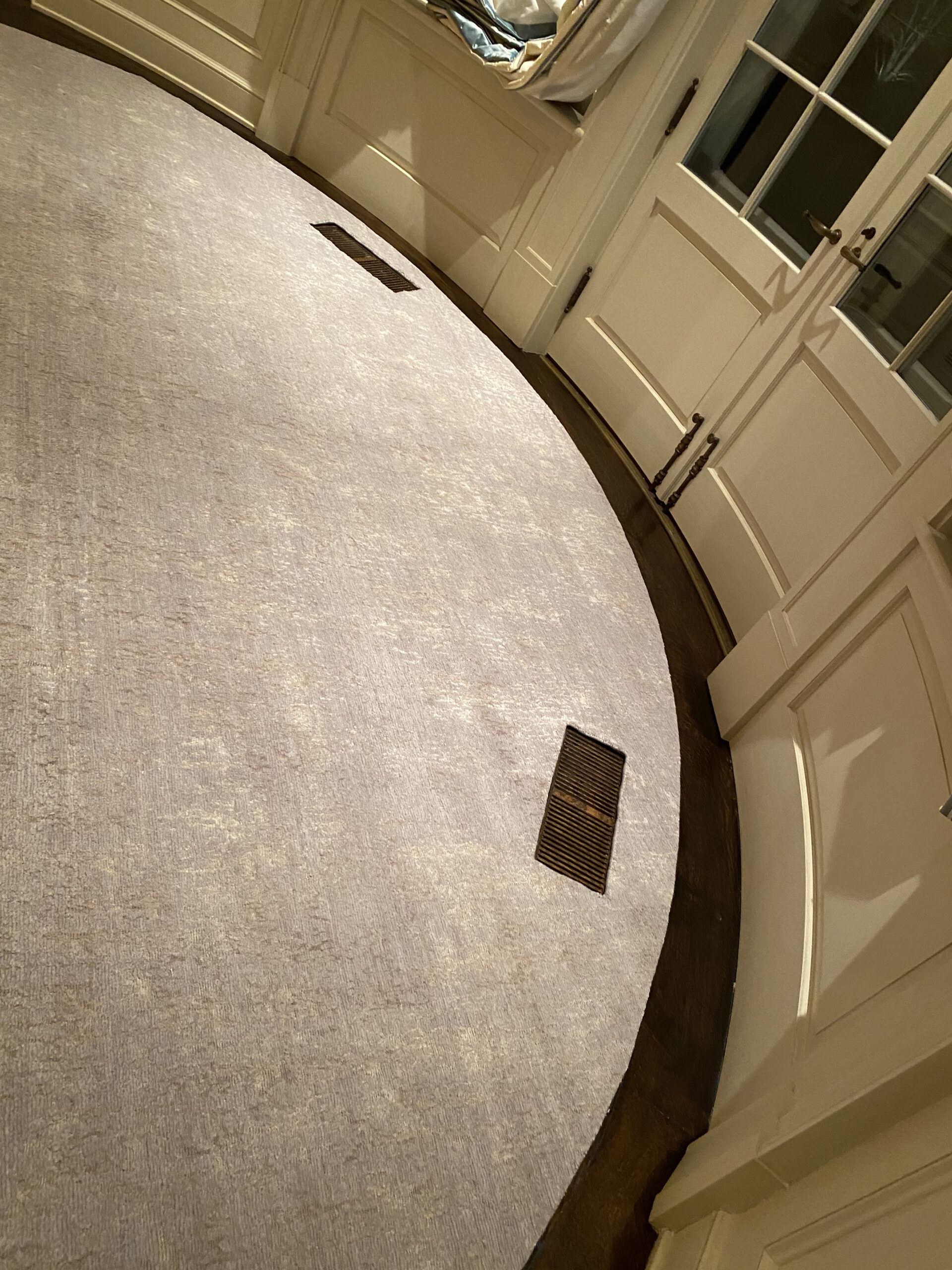 Achieved through a template-guided cut, continuous binding or serging, and blocking for a calm, lay-flat finish. Perfect for foyers, bay windows, and round dining tables.